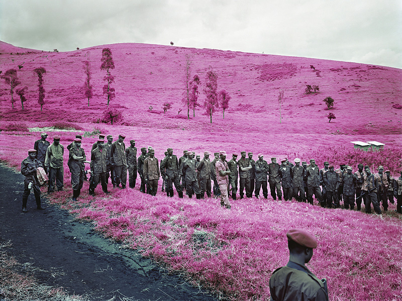 Kodak Aerochrome analogue infrared photograph taken in Masisi, North Kivu, Eastern Congo, in Feb 2010, showing FDLR rebels on day of integration into the Congolese National Army, FARDC.