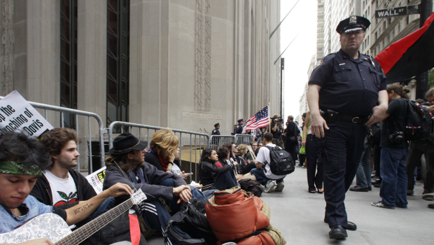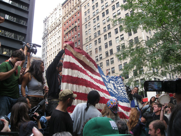 Membros da organização – Occupy Wall Street – levantam uma bandeira crida, para este movimento de protesto, pelo artista John McCarthy