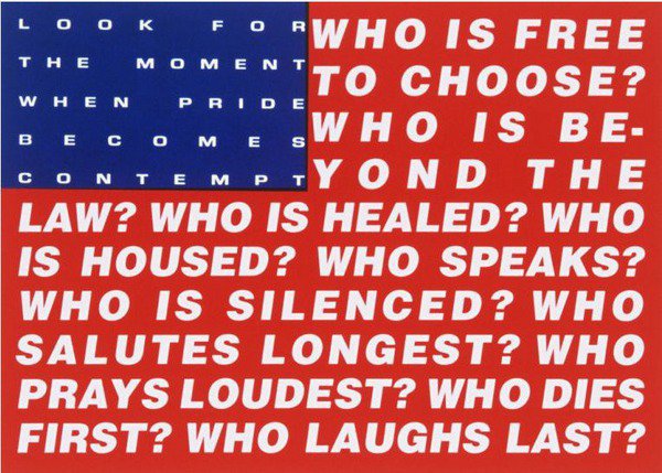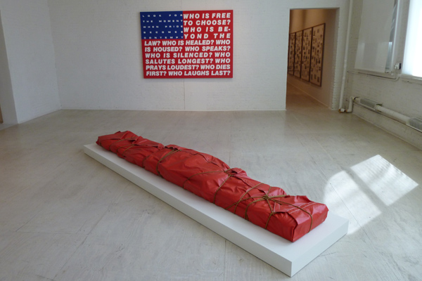 Christo “Red Package”, 1968, no chão e Barbara Kruger “Untitled (Questions)”,1991, na parede. September 11, MoMA PS1