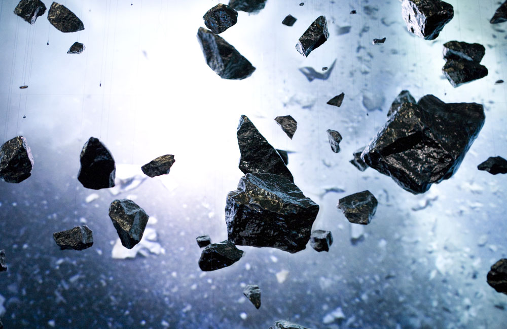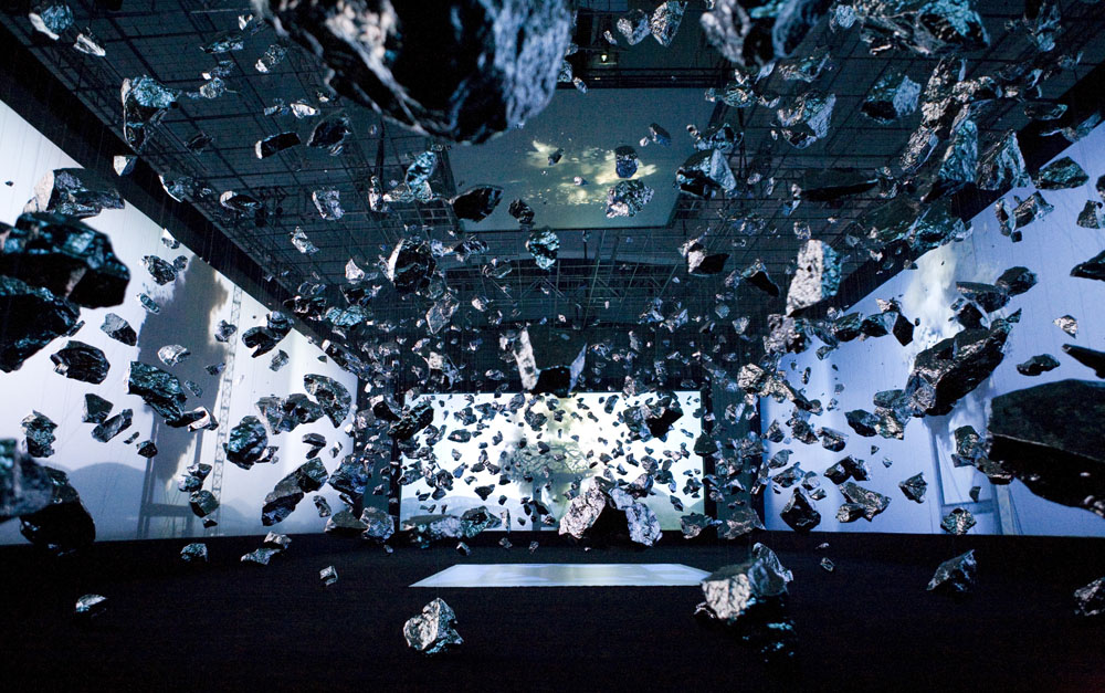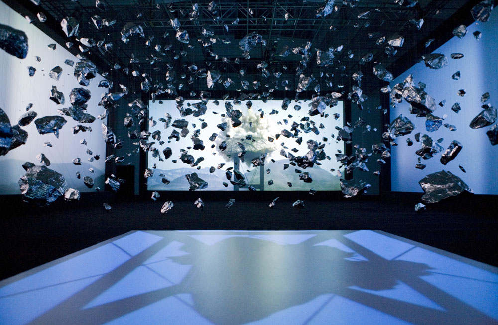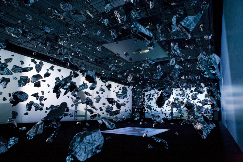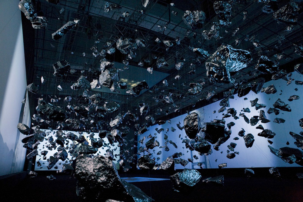 Escultura e instalação para recriar a grande explosão (big bang) inerente à teoria do desenvolvimento inicial do universo. Wang iniciou o processo de produção, deste projeto, explodindo uma pedra gigante nas montanhas da província de Shandong e registou o acontecimento em vídeo a partir de seis ângulos diferentes. O resultado é projetado, na exposição, em telas gigantes. Suspensas, por toda a exposição, estão, também, mais de 5.000 réplicas de pedras da referida explosão. A sua superfície cintilante reflete a imagem da explosão para o infinito criando, assim, um abismo sem fim que lembra o nascimento do universo. Zhan Wang iniciou a sua carreira em 1993, expondo regularmente na China, a partir dos final dos anos noventa começou a expôr internacionalmente (EUA, Reino Unido, Canada, Alemanha, Noruega, Austria, Dinamarca, Coreia, Japão, Suécia, entre outros). É dos mais reconhecidos escultores chineses da atualidade.