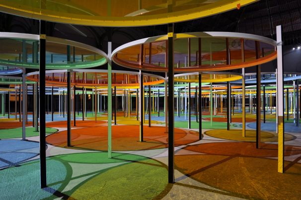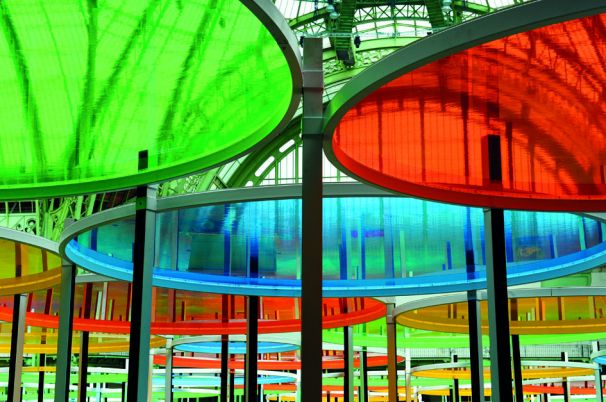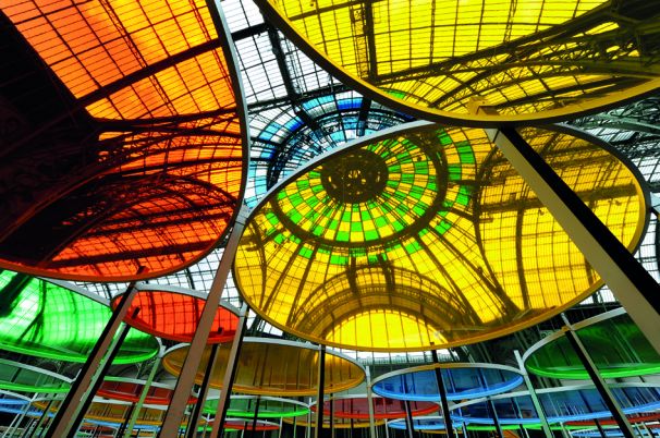 A Monumenta convida todos os anos um artista contemporâneo, de renome internacional, a “invadir” a nave do Grand Palais, em Paris, com uma obra magistral concebida para essa ocasião. Em 2011 foi apresentada uma criação de Anish Kapoor. Para a edição deste ano, que será a quinta, o convite foi endereçado a Daniel Buren (n. 1938 França) considerado um dos grandes artistas franceses da actualidade. O resultado intitula-se “Excentrique(s), travail in situ” e trata-se de um twister contínuo de cor que cobre todo o espaço, do piso térreo, que mede 13.500 metros quadrados. A altura desta supra-estrutura é a mínima exigida para um apartamento padrão em Paris. Uma floresta psicadélica, por baixo da monumental abóbada de vidro do Grand Palais.