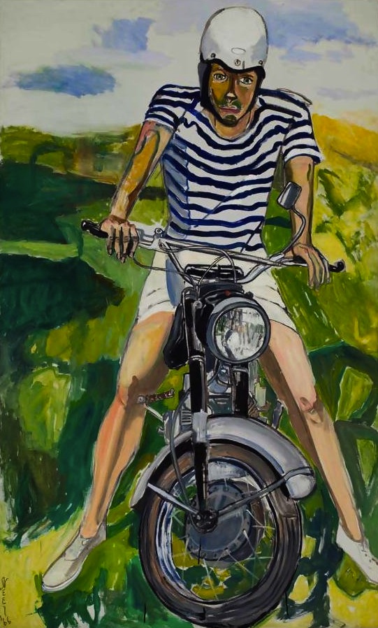 Alice Neel, Hartley on the Motorcycle, 1966, Oil on canvas, 210.2 x 127.3 cm. Aurel Scheibler Gallery. Courtesy of Art Basel.