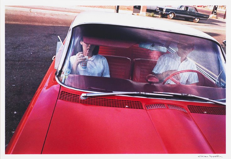 William Eggleston, “Dust Bells 2 — Couple in red car at drive-in restaurant”, 1965-1975, ©2012 Eggleston Artistic Trust, Cortesia Cheim & Read, New York.