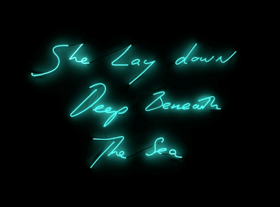 Tracey Emin, She Lay down Deep Beneath The Sea, 2012, aquamarine neon, © the artist courtesy of White Cube, photo: Ben Westoby.