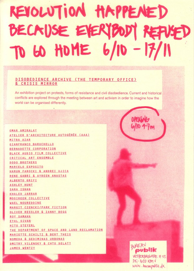 A exposição parte do projecto Disobedience Archive – arquivo da desobediência (O escritório temporário) do curador Marco Scotini – um arquivo que reune obras de carácter marcadamente político que assumem o seu activismo através da arte. O arquivo contém uma extensa coleção de material vídeo que analisa as diferentes táticas de resistência, seja através do activismo directo ou da produção de contra-informação. Esta coleção, de imagens heterogéneas, funciona como um guia histórico que documenta, entre outros: as lutas sociais italianas de 1977, os protestos à escala global (antes e depois de Seattle) e as atuais insurreições no Médio Oriente e no Mundo Árabe.