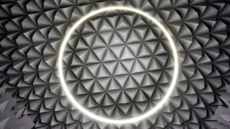 Haroon Mirza, The national apavilion of then and now (detail), 2011 Anechoic chamber, LED’s, amp, speakers, electronic circuit. Courtesy the artist and Lisson Gallery