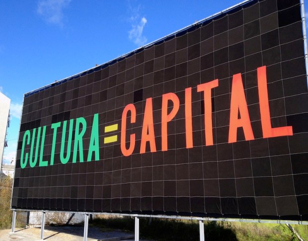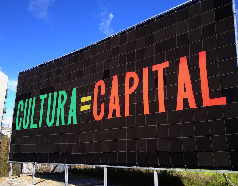 Alfredo Jaar, Cultura = Capital, Painel têxtil, 1400 cm x 600 cm Instalação de exterior. Rotunda da Avenida D.João IV. Cortesia de Guimarães 2012.
