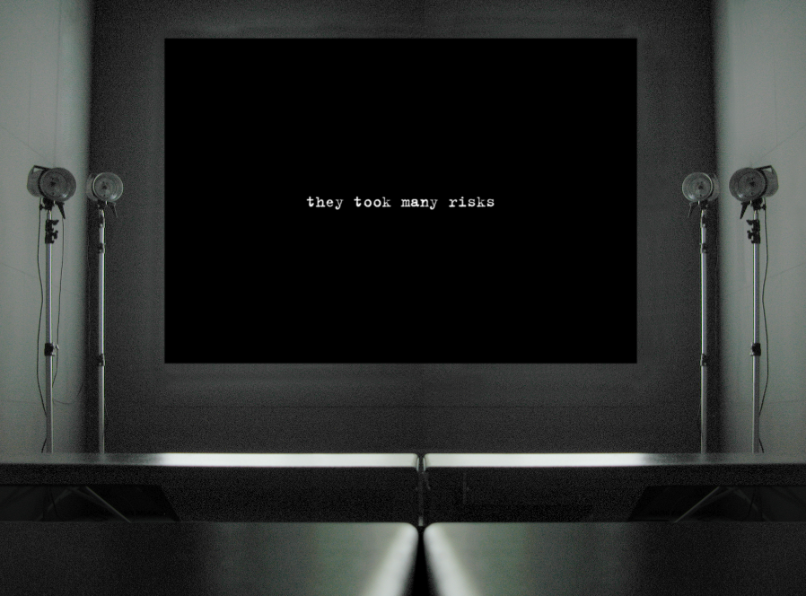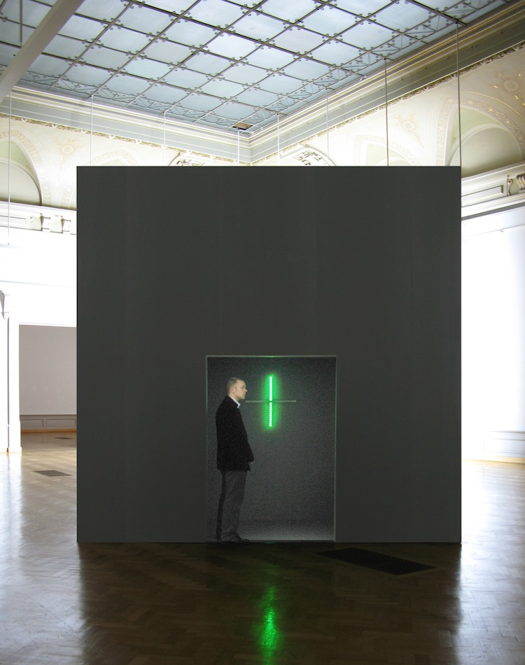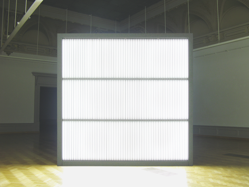 Alfredo Jaar, The Sound of Silence, 2006, Installation with wood, aluminum, fluorescent lights, strobe lights and video projection. Software design by Ravi Rajan. Courtesy the artist, New York.
