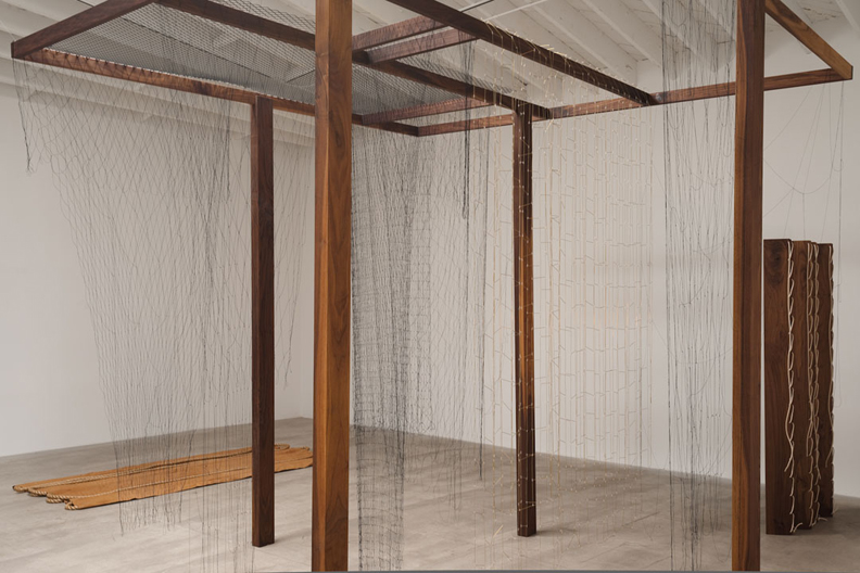 RaumplanSegundo Beatriz Colomina foi Ariadne quem concebeu a primeira obra de arquitectura, ao entregar a Teseu um novelo de linha, por meio do qual ele encontrou o caminho para sair do labirinto, depois de ter morto o Minotauro. Para alcançar esse objectivo fez uso da representação, servindo-se de um dispositivo conceptual – o novelo de linha. O fio de Ariadne não é uma mera representação (dentro das infinitas possíveis) do labirinto: “É um projecto, uma produção autêntica, um dispositivo que tem como resultado colocar em desequilíbrio a realidade”.Este projeto tem vários momentos de pesquisa que fui fazendo a partir de uma primeira passagem pelo Brasil em 2008. Interessou-me ligar dois edificios, que foram construídos no final da década de 40, um em Lisboa e o outro no Rio de Janeiro. Ambos incorporam dentro da sua linguagem moderna o modelo vernacular.Uma estrutura em madeira de teka está suspensa por cordas na sala da galeria. É uma estrutura aberta, cujas partes geram uma divisão no espaço. É digamos a escultura “mãe” que alberga todas as outras. Esta “malha” feita à escala 1:1, revela uma “janela” existente num edificio em Lisboa: o Edificio de habitação, comércio e serviços, Bloco das águas livres 1953-1956, desenhado pelo arquiteto Nuno Teotónio Pereira. Segundo Ana Tostões este é talvez o “único exemplo consequente de unidade de habitação em Portugal”.Este edificio multiusos propunha grandes novidades em relação aos correntes edificios de habitação. Idealizado para servir uma comunidade e não apenas para “conter gente”, foi programado com serviços coletivos que denunciavam uma progressista visão da sociedade e uma vontade de introduzir a modernidade na vida quotidiana. Na sua origem está uma companhia de seguros que pretendia aplicar algum do seu capital numa obra de qualidade para uma clientela de alto standard, o que permitiu erguer uma construção em conformidade. Foram usados materiais inéditos, com um “realismo” que permitiu ultrapassar as posições mais dogmáticas do “movimento moderno”.Da estrutura suspensa no espaço da galeria “caem” outras esculturas feitas em couro, cordas de nylon, redes em fio de nylon e arame de latão. Algumas destas peças funcionam como “paredes” e estão agarradas por cordas, reenviando para partes de muros existentes no edificio “bloco das águas livres”.Outras esculturas suspensas nesta estrutura continuam a série de esculturas chamada “random intersections”. Funcionam como “espectros”, pela ausência de um volume que lhes dê forma e sentido.Três biombos amarelos intersectam o espaço em diferentes movimentos. Estes elementos fazem referência ao Edificio “Nova Cintra” de Lucio Costa no Rio de Janeiro, construído em 1948.Lúcio Costa construiu três blocos de apartamentos no Rio de Janeiro no Parque Guinle. Os três prismas ortogonais, respectivamente “Nova Cintra”, “Bristol” e “Caledónia” foram construídos nos anos de 1948, 1950 e 1954. Seguindo os princípios do movimento de vanguarda Europeia e sob a influência de Le Corbusier, estes blocos foram os primeiros edifícios no Brasil a ser construídos sobre pilotis e de uma certa maneira, eles influenciaram o planeamento de Lúcio Costa da cidade de Brasília.Uma miríade de fragmentos de elementos existentes em ambas as fachadas, são reproduzidos com materiais diferentes e em consistências diferentes, contendo o seu próprio significado e carga. Estes elementos são justapostos em camadas, de modo fragmentado, enchendo ou esvaziando o espaço. – Leonor Antunes