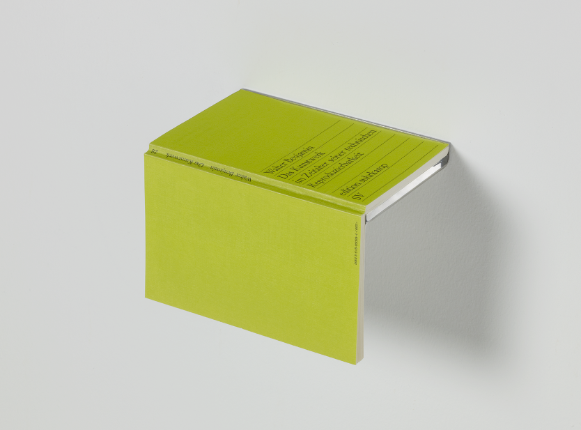 Fernanda Fragateiro, Walter Benjamin, Das Kunstwerk im Zeitalter seiner technischen Reproduzierbarkeit, 2012. Aço inoxidável polido, acrílico e livro de Walter Benjamin: “Das Kunstwerk im Zeitalter seiner technischen Reproduzierbarkeit”, Edição Suhrkamp, Alemanha, 1977; Design da capa por Willy Fleckhaus10,5 x 10,5 x 17 cm