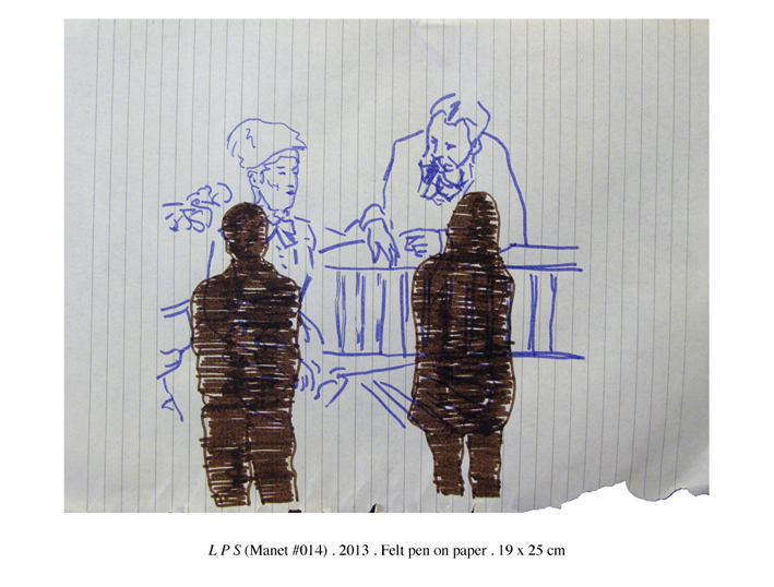 Se em alguns destes trabalhos o artista se limitou a recuperar imagens reproduzidas de obras do pintor (ready-mades portanto) para as reinscever de silhuetas que ocupariam o “lugar do espectador” (questão crucial em toda a obra de Manet, como sabemos) em outras ele mesmo reproduziu sinteticamente através de desenhos quase diagramáticos figuras retiradas do niverso de Manet para as confrontar com a silhueta recortada e sombria desse mesmo espectador cuja presença activa passou a contagiar definitivamente o espaço pictural transformando-o num espaço impróprio e em consecutiva perda de referências outras que não as que este mesmo lhe vai impondo… – Bernardo Pinto de Almeida, Fevereiro 2013