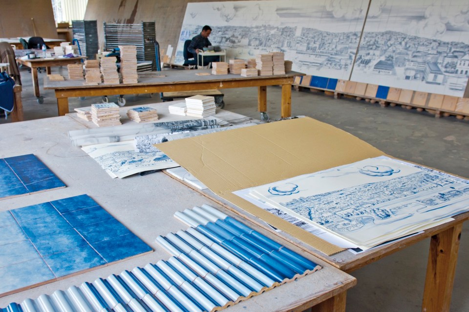 A instalação Grande Panorama de Lisboa (Séc. XXI) em desenvolvimento na Fábrica Cerâmica Viúva Lamego, em Sintra. Fotografia: Bruno Portela. © Unidade Infinita Projectos.