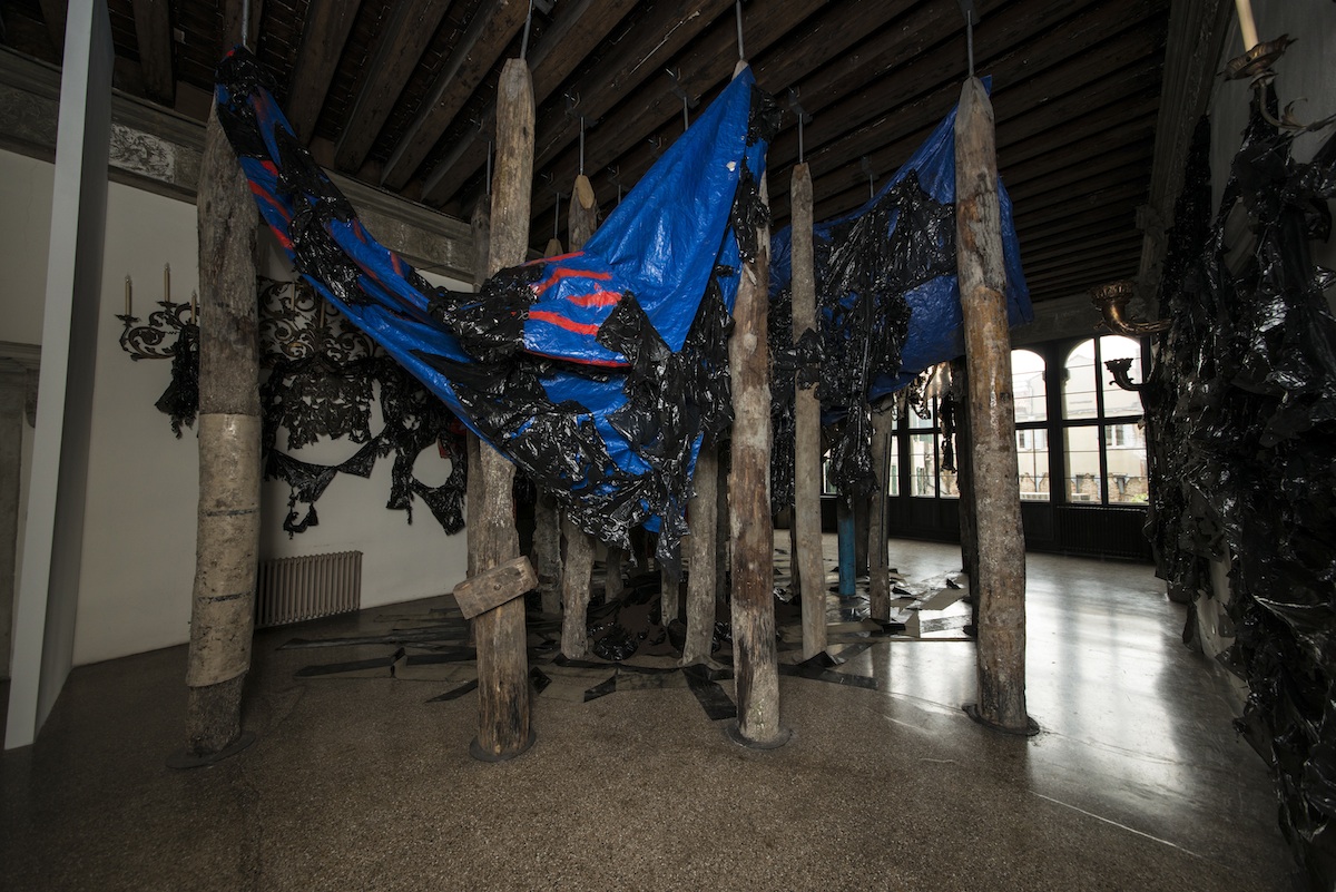 Abigail DeVille, Wild Seed, 2013. Wooden piles, iron, canvas, paint. Courtesy PinchukArtCentre. Photo by Sergey Illin.