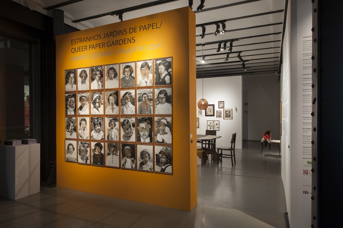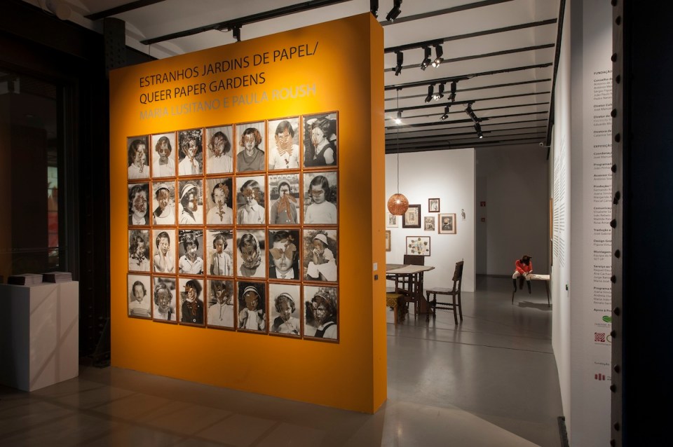 paula roush e maria lusitano, Queer paper gardens/ Estranhos jardins de papel, exhibition view | Museu da Electricidade, Lisboa. Installation with video, mixed media collage salon, publications, drawings and archive, 2012- 2013.