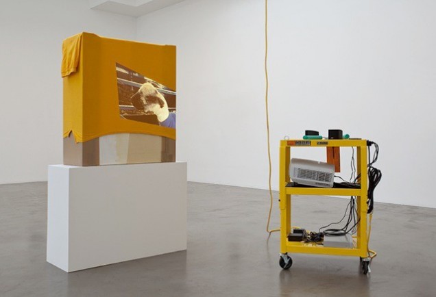 Rachel Harrison, AA, 2010. Wood, bubble wrap, cardboard, acrylic, tennis shirt, A/V cart, DVD player, speakers, projector, extension cord, five hair rollers, pack of gum, ear plugs, and American Apparel video, color, sound, 18 minutes (2009). Courtesy of the artist, Greene Naftali, New York and Regen Projects, Los Angeles. Photography by Brian Forrest.
