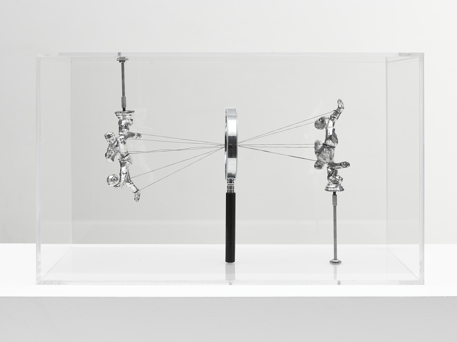Damian Ortega, How to See, 2013, Plexiglas vitrine, magnifying glass, thread and metal figures, 11 13/16 x 19 11/16 x 9 13/16 in. (30 x 50 x 25 cm) © Damián Ortega. Photo: Ben Westoby. Courtesy White Cube.