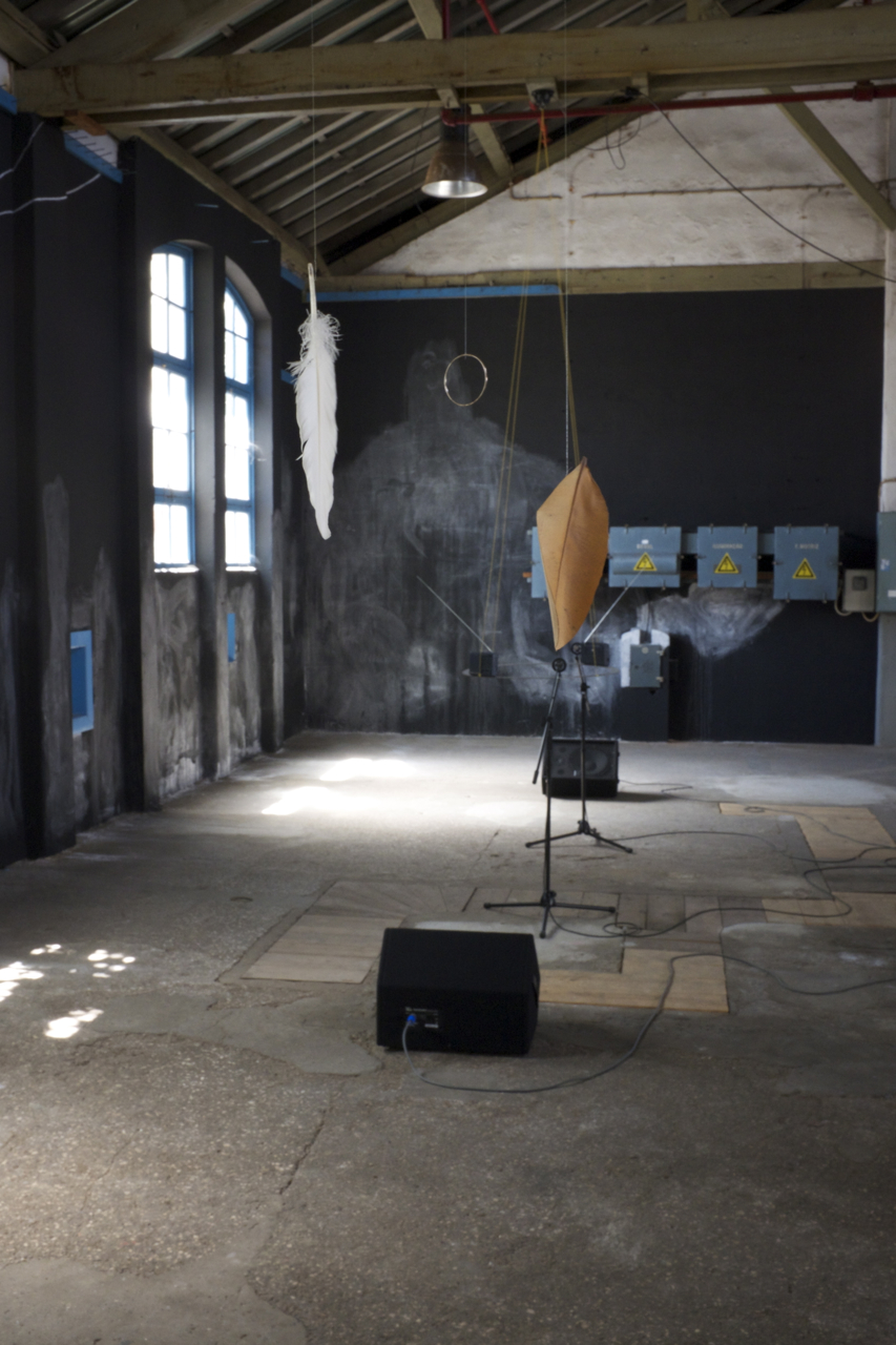 João Ferro Martins Mobile, 2013. Três motores de relógio, alumínio, balsa, pena, folha, argola de metal. Exposição ‘Contínuo’ de João Ferro Martins e Miguel Palma, no Museu da Carris. Cortesia dos artistas.