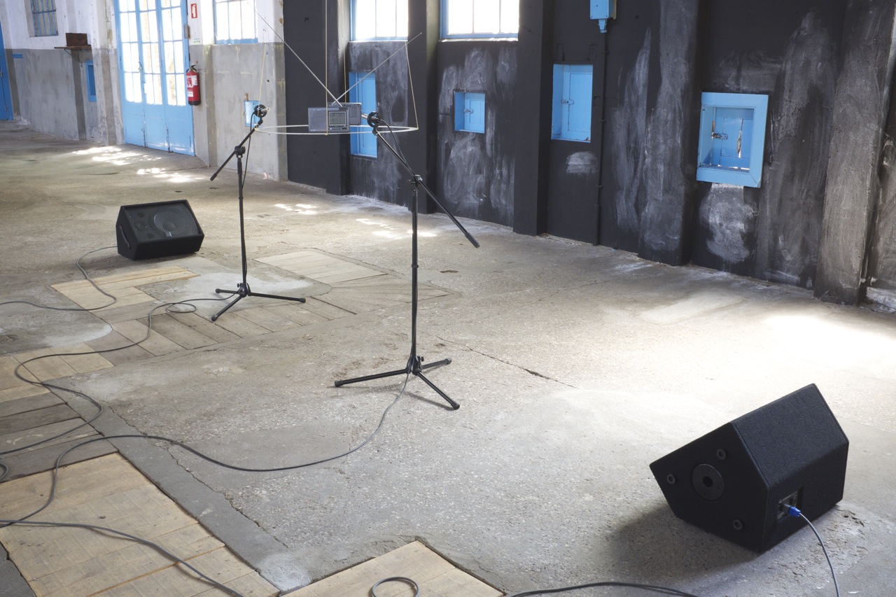 João Ferro Martins Contraponto para dois rádios, 2013 Motor eléctrico, 2 rádios, 2 monitores, 2 tripés de microfone , 2 microfones, amplificador, mesa de mistura, cabos áudio, alumínio, cordel. Exposição ‘Contínuo’ de João Ferro Martins e Miguel Palma, no Museu da Carris. Cortesia dos artistas.