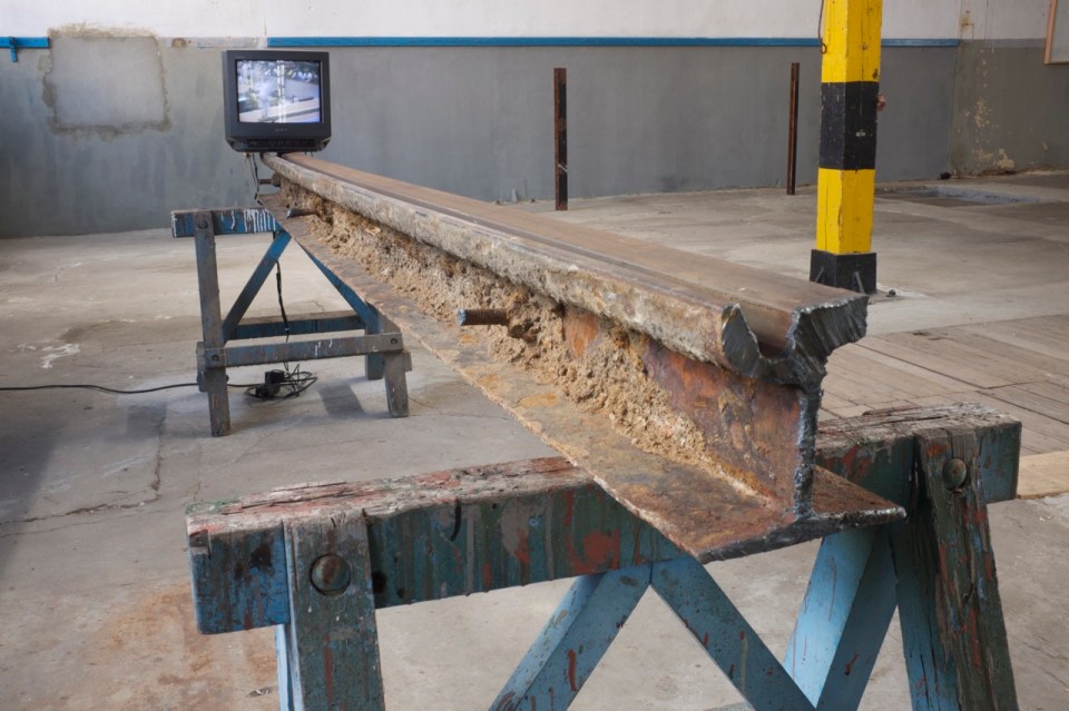 Miguel Palma Sem Rede, 2013. Secção de carril de eléctrico, cavaletes de serralharia, TV. Exposição ‘Contínuo’ de João Ferro Martins e Miguel Palma, no Museu da Carris. Cortesia dos artistas.