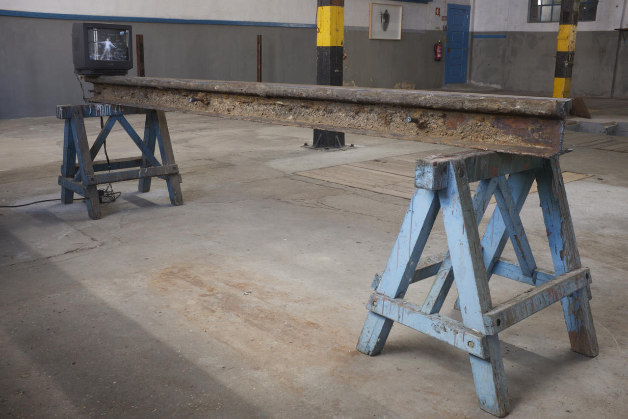Miguel Palma Sem Rede, 2013. Secção de carril de eléctrico, cavaletes de serralharia, TV. Exposição ‘Contínuo’ de João Ferro Martins e Miguel Palma, no Museu da Carris. Cortesia dos artistas