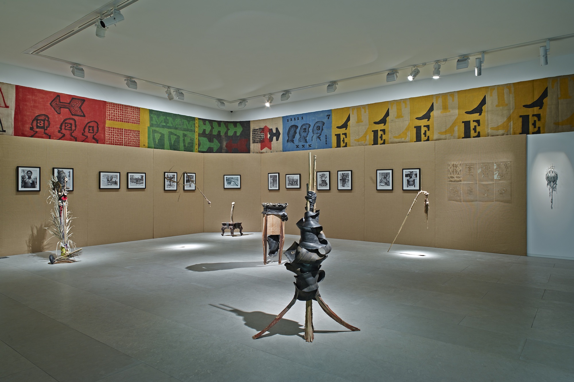 ‘Lições da Escuridão, Sala 2. Interface Makonde, Otelo Fabião (esculturas), 2012; Fotografias de Manuel Viegas Guerreiro; faixa em juta de José de Guimarães. Cortesia Centro Internacional das Artes José de Guimarães, 2013