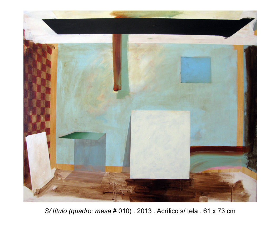 Duas obras, respectivamente Sem título (quadro; mesa #009) e Sem título (quadro; mesa #004), são exemplares deste processo de construção e síntese que o pintor desenvolve como um ensaio. Na primeira obra aqui referida vemos um espaço dentro de outro espaço, como se se tratasse de uma câmara dentro de uma outra câmara em que ambas estão sujeitas a um emergente movimento que os planos horizontais, quais mesas disponíveis para uma qualquer acção, parecem contrariar. Na segunda obra, Sem título (quadro; mesa #004) os planos de tom mais claro, próximo do branco, estão encostados a uma suposta parede, como telas, pranchas, ou elementos construtivos da pintura, que evidenciam a memória de um espaço disponível para um qualquer acontecimento.
