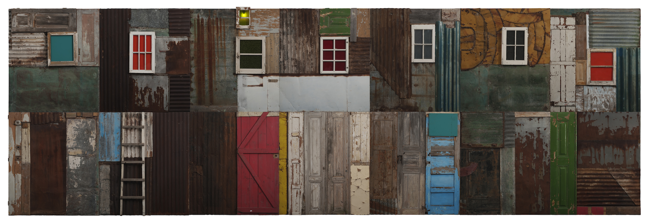 António Ole (1951) Township Wall (XI), 2004. Madeira, chapa de ferro, zinco, portas, janelas, vidro e fibras sintéticas. © DMF, Lisboa. Cortesia Culturgest.