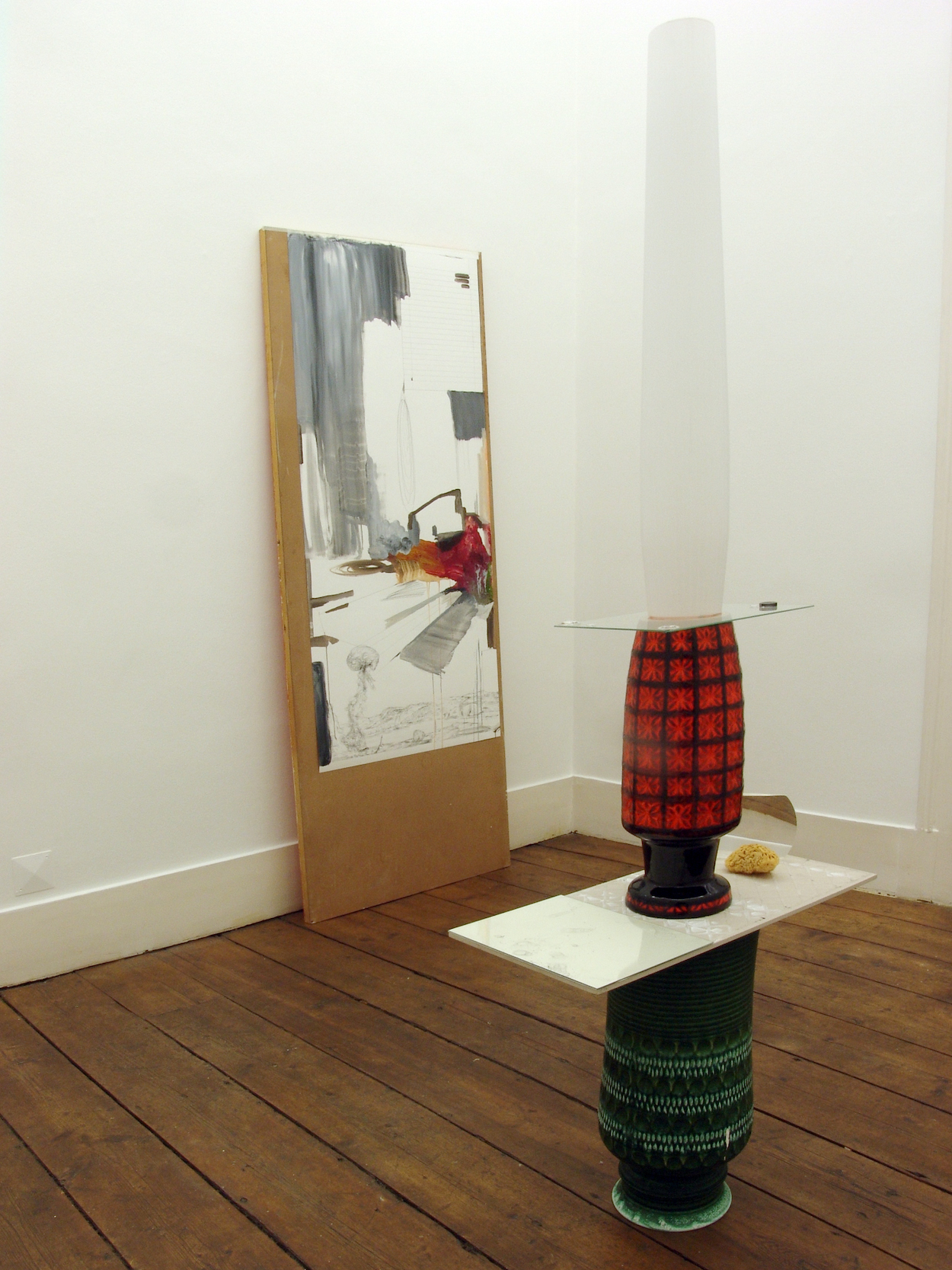 Susanne S. D. Themlitz, Em destaque: Sem título (Deutscher Brunnen com esponja e lupas), 2014, Cerâmica, mosaico hidráulico, grafite sobre papel, vidro, esponja, lupas, Ceramic, flagging, graphite on paper, glass, sponge, magnifiers, 170 × 60 × 30 cm e ‘Lá em baixo’, 2013, Óleo e grafite sobre papel , Oil and graphite on paper, 150 × 67 cm.