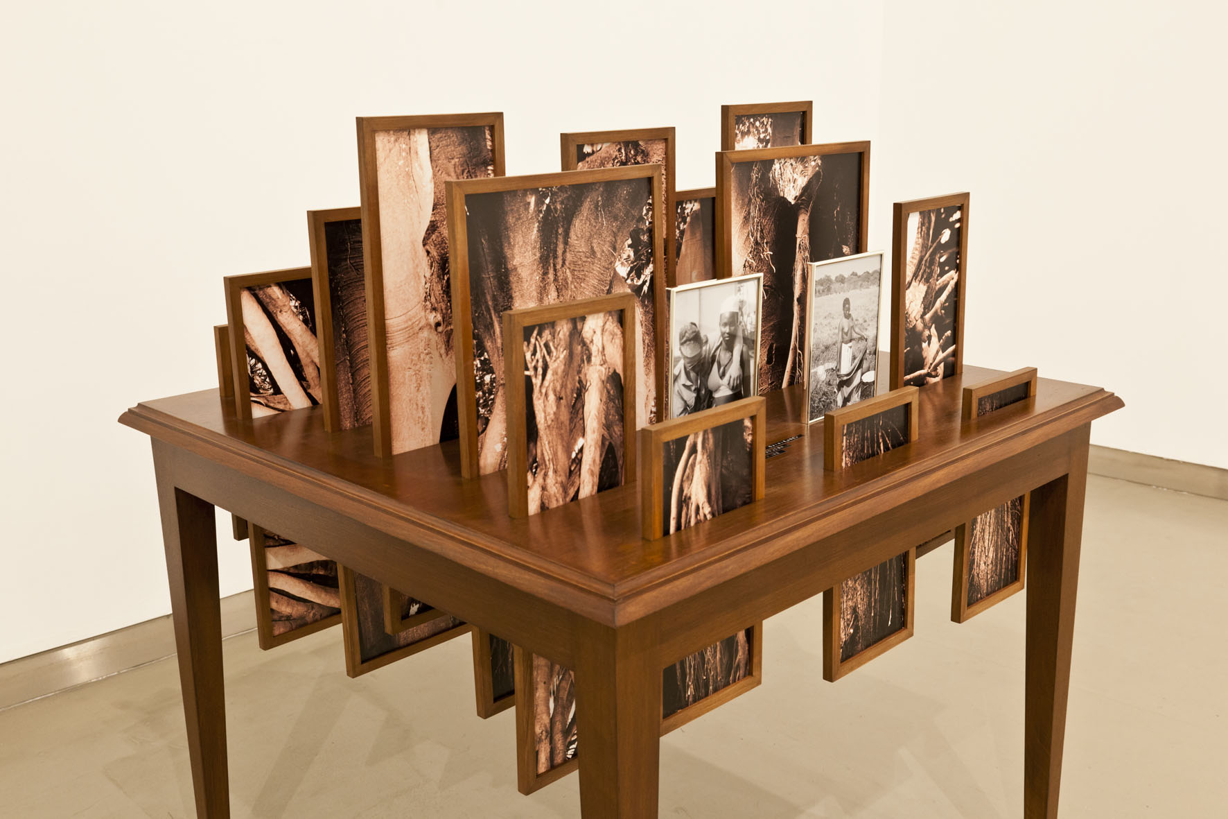 Vasco Araújo, Botânica, 2012. Esculturas/ Sculpture Mesa de madeira, Mesa de madeira, 21 fotografias digitais, molduras de madeira e metal/ Wood table, 21 Digital Photographs; wood and metal frames. Dimensões/ Dimensions: 100x100x120cm. Cortesia do artista, da galeria Baginski e do MNAC-Museu do Chiado.