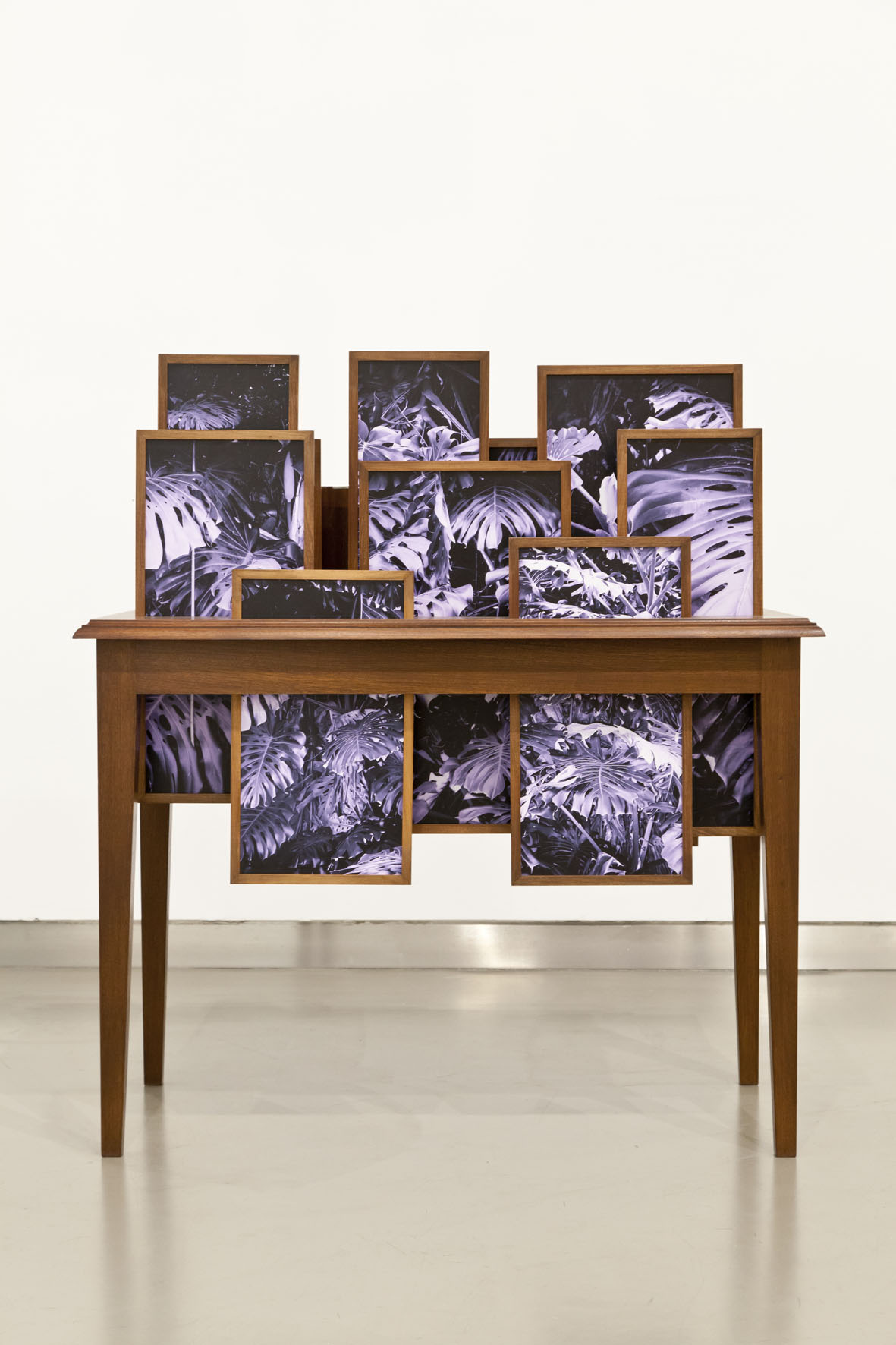 Vasco Araújo, Botânica, 2012. Esculturas/ Sculpture. Mesa de madeira, 14 fotografias digitais, molduras de madeira e metal/ Wood table, 14 Digital Photographs; wood and metal frames. Dimensões/ Dimensions: 60x110x120cm. Cortesia do artista, da galeria Baginski e do MNAC-Museu do Chiado.