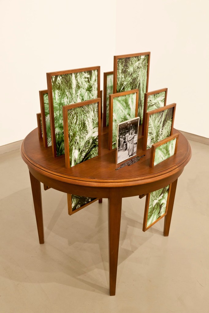 Vasco Araújo, Botânica, 2012. Esculturas/ Sculpture Mesa de madeira, 15 fotografias digitais, molduras de madeira e metal/ Wood table, 15 Digital. Photographs; wood and metal frames. Dimensões/ Dimensions: 100x100x120cm. Cortesia do artista, da galeria Baginski e do MNAC-Museu do Chiado.