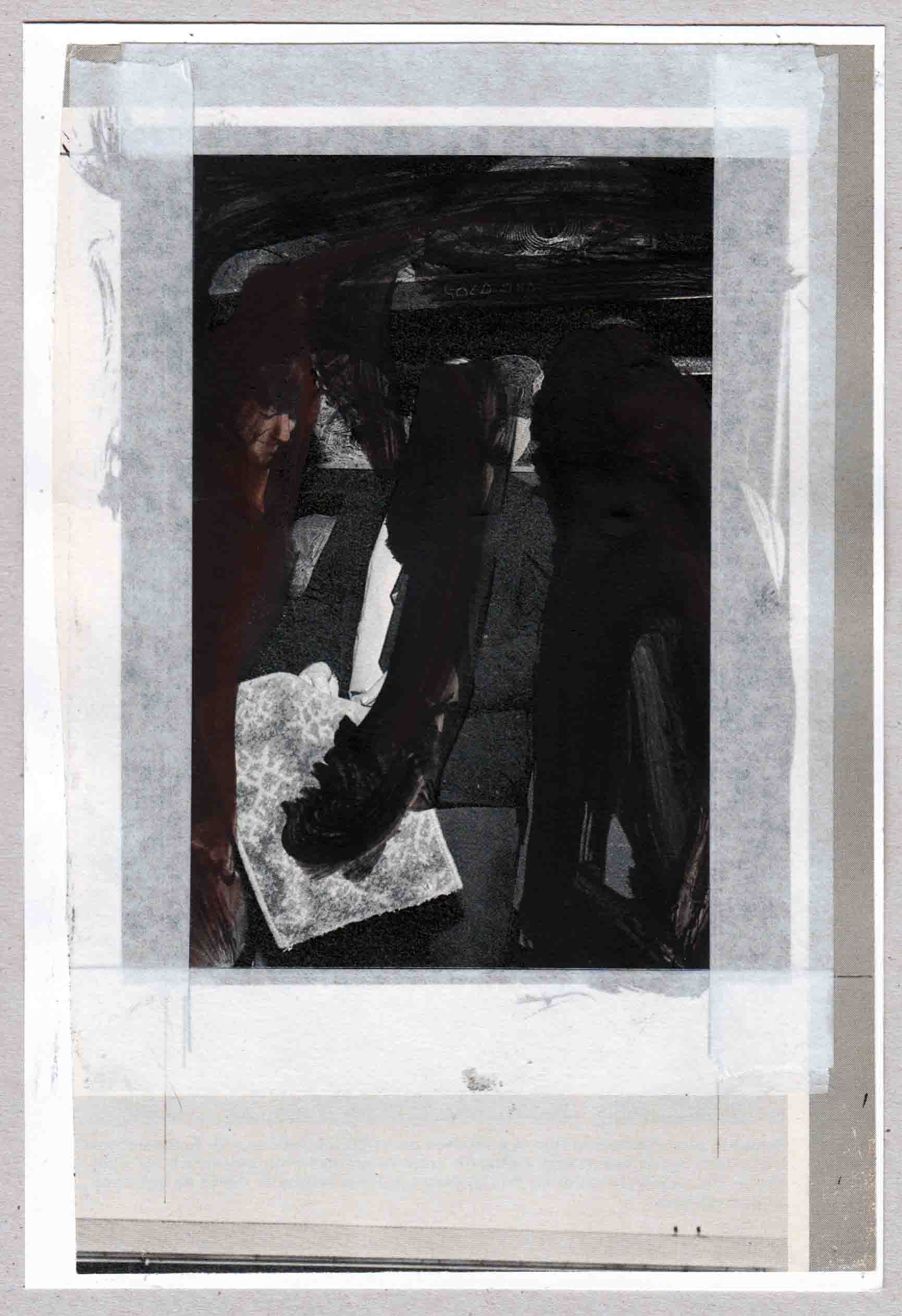 Pedro Sousa Vieira, Koeksisters. 2013. Acrílico, grafite e fita de reparação de arquivo sobre recorte de revista sobre papel | Acrylic, graphite, and archive mending tape on magazine clipping on paper. 20,5 x 14 cm | 8,07 x 5,51 © Pedro Sousa Vieira 2013. Cortesia do artista.