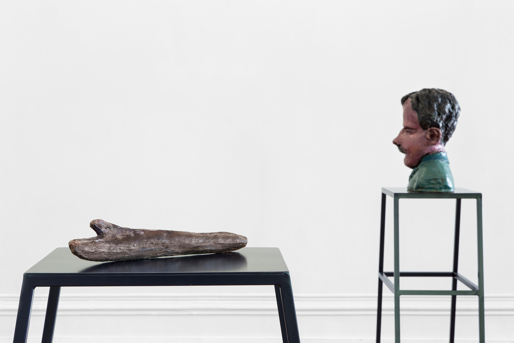 Musa paradisiaca, Pau – mão, 2014 e O sono de Francisco, 2014. Breu pintado. Vista de instalação, Kunsthalle Lissabon, Lisboa Foto: Bruno Lopes. Cortesia dos artistas e Kunsthalle Lissabon.
