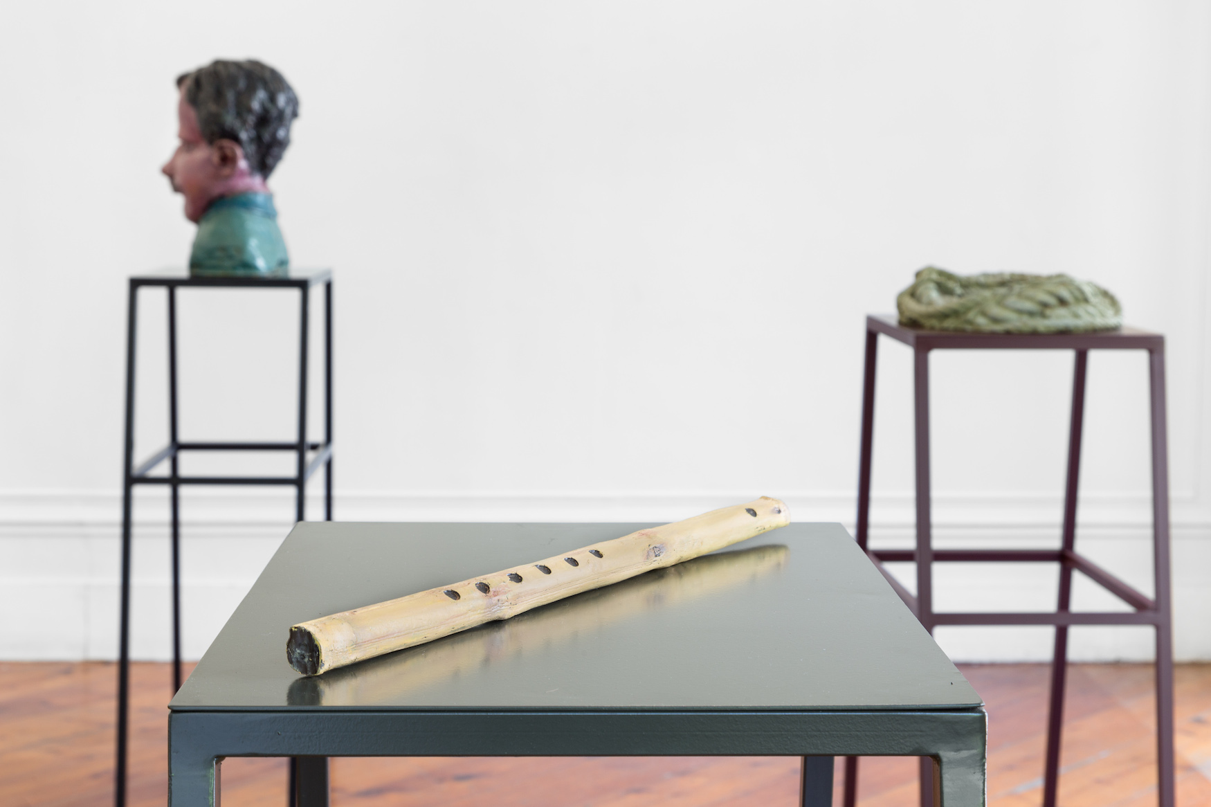 Musa paradisiaca, Flauta, 2013, O sono de Francisco, 2014 e Corda, 2014. Breu pintado. Vista de instalação, Kunsthalle Lissabon, Lisboa Foto: Bruno Lopes. Cortesia dos artistas e Kunsthalle Lissabon.
