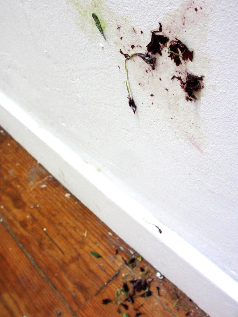 Vista da exposição Art Stabs Power:que se vayan todos!; Manuel Santos Maia, instalação Non_conservado entre a linha da linguagem e, mais longe, a praia calma da destruição, 2010 {mural – pétalas e impressão de cravo vermelho sobre parede } © Inês Valle.
