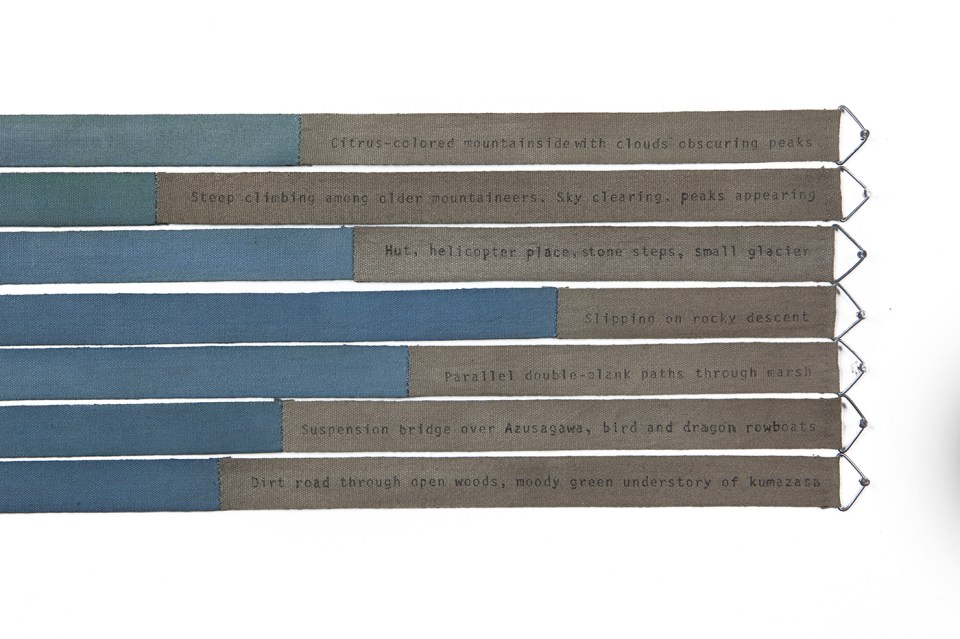 Helen Mirra, Hourly field notes, 10 October, Dakesawa, 2012 (pormenor) Tinta de máquina de escrever e aguarela sobre algodão.