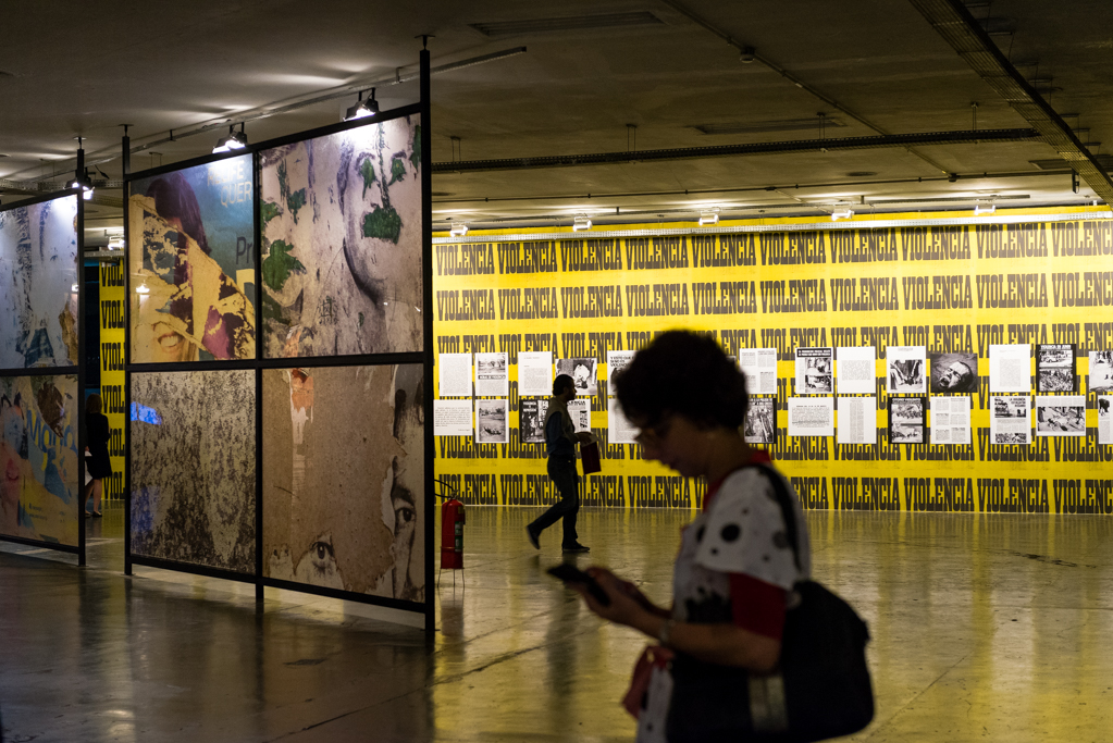 Público visita a exposição durante a abertura para convidados da 31a Bienal. O projeto “Voto!”(a esquerda) , de Ana Lira e o projeto “Violência” ( a direita), de Juan Carlos Romero.