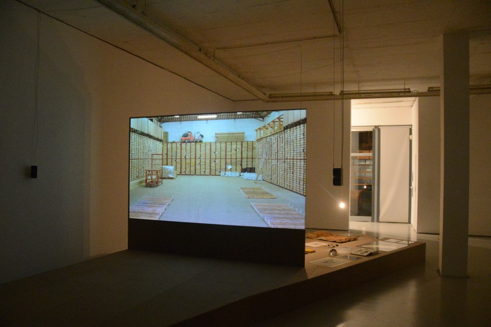 Filipa César, Mined Soil, 2012-14 Elementos expostos | Elements on display : Plataforma em aglomerado | Plywood structure Cortesia da Artista e Cristina Guerra Contemporary Art, Lisboa.