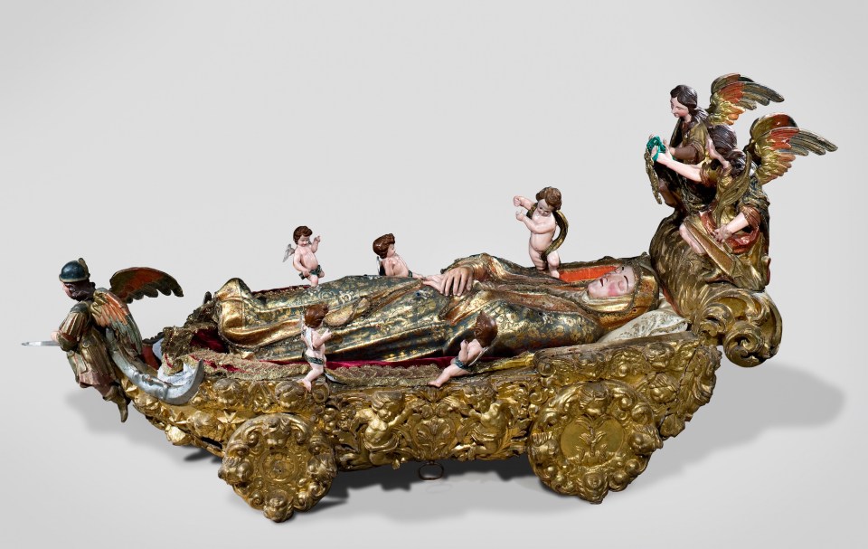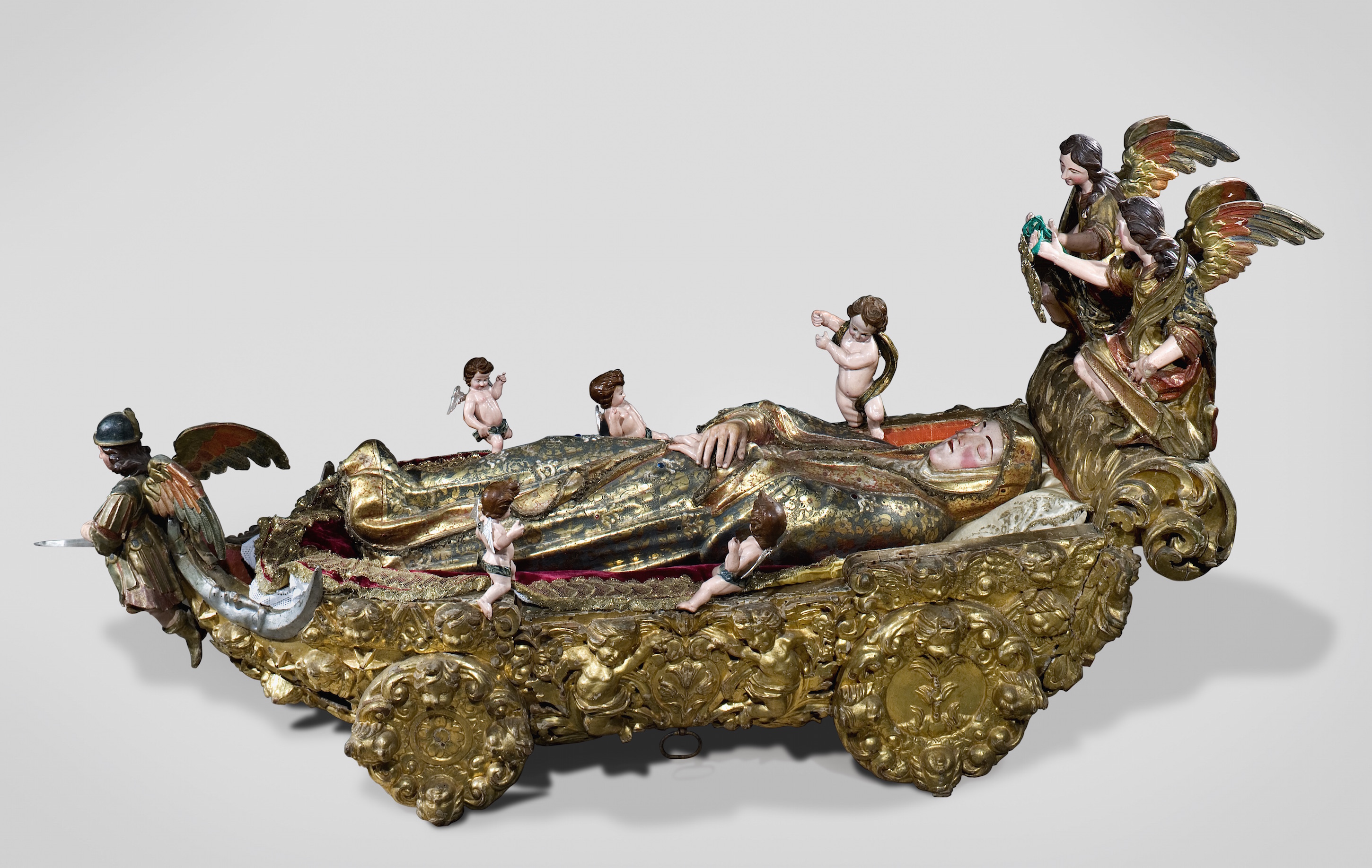 Dormição da Virgem Portugal – Século XVII/XVIII. Escultura de vulto pleno em madeira dourada, policromada, estofada, talha dourada A.140 cm x L. 71 cm x C. 250 cm Santuário de Nossa Senhora da Conceição, Vila Viçosa.