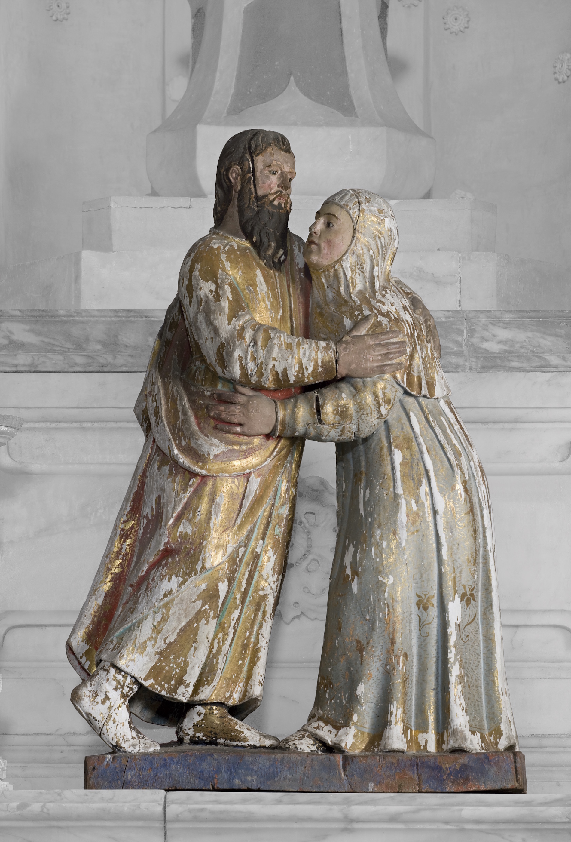 Abraço junto à Porta Dourada. Portugal – XVII/XVIII. Escultura de vulto pleno em madeira dourada, estofada, policromada. A.110 cm x L.73 cm x Pr.31 cm Igreja de Nossa Senhora da Conceição, Monforte.