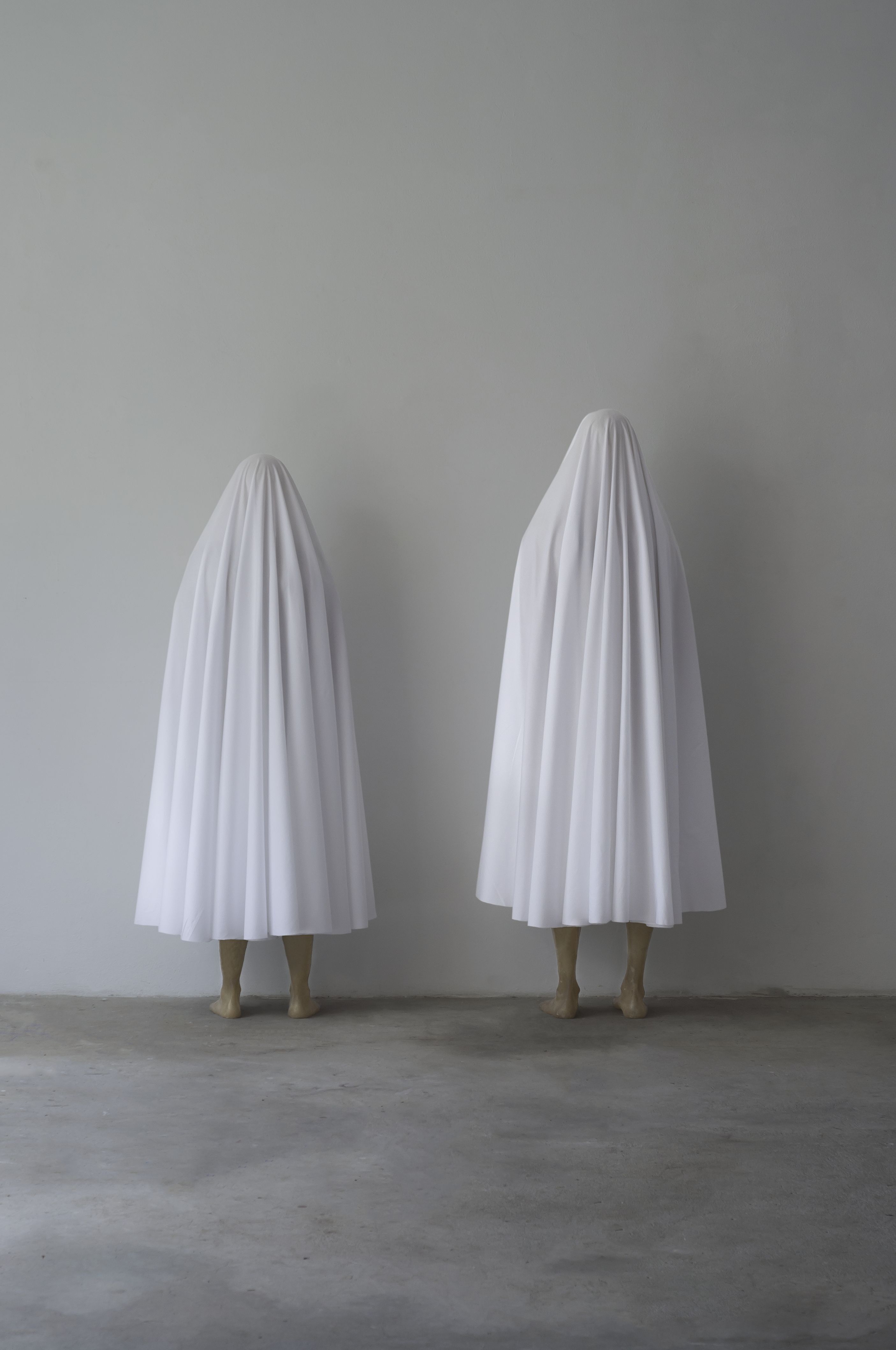 Sara & André, Couple-in-Waiting, 2014. Resina, fibra de vidro e tecido, 164 x c. 62 x c. 48 e 176 x c. 77 x c. 50 cm. Cortesia dos artistas e MNAC.