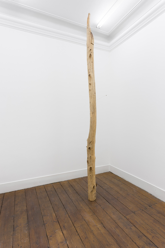 Joana Escoval, Help is not on the way, 2014 Tronco de cedro derrubado por tempestade, latão, linho, pena de periquito Aprox. 360 × p 52 cm. Cortesia da artista e Vera Cortês Art Agency, Lisboa, 2014-2015.
