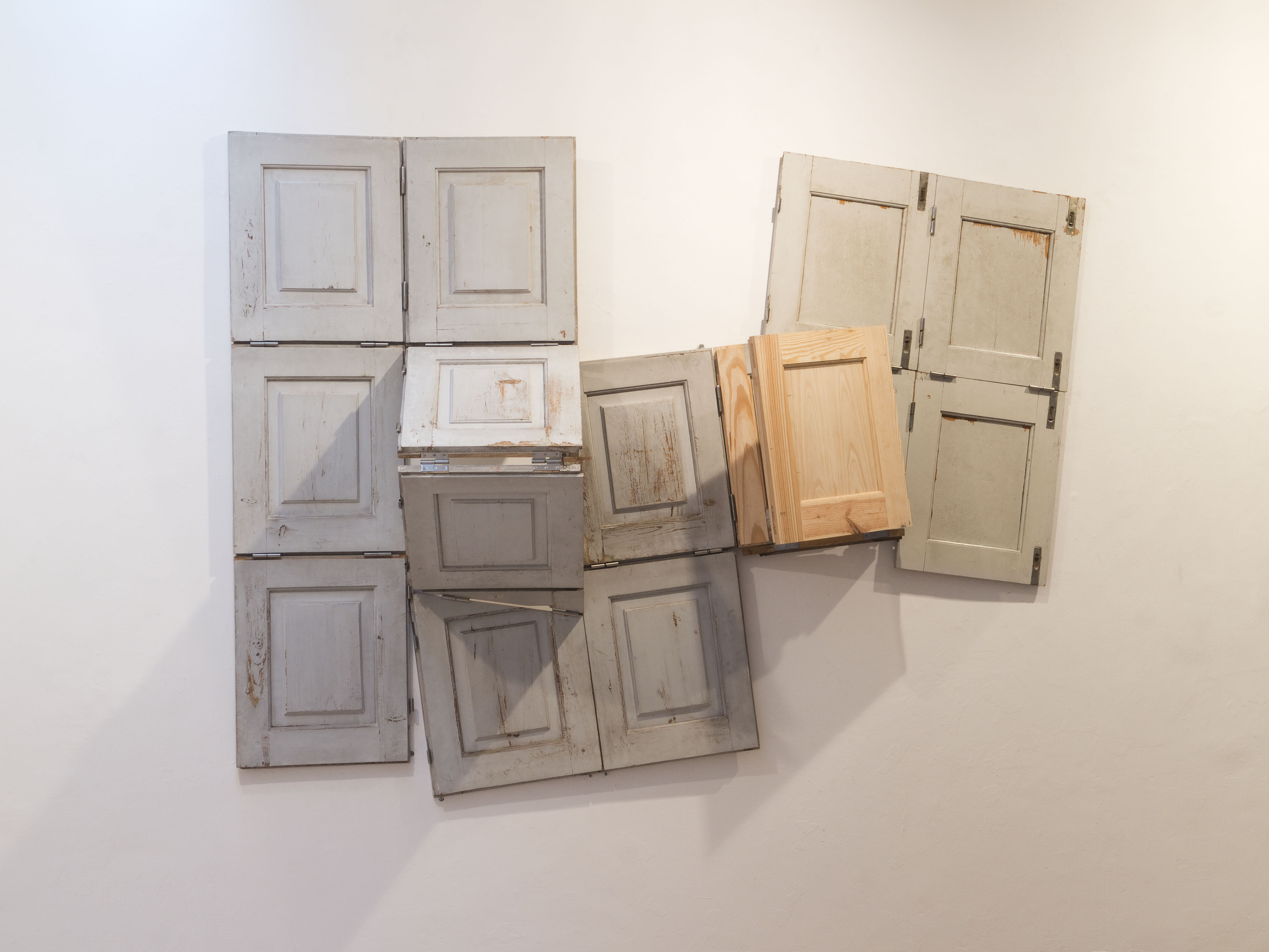 Nuno Sousa Vieira, Para Não Ficarmos Sujeitos a Um Exterior Qualquer, 2014. 15 portadas de madeira e ferragens, 220x260x40cm. Exposição “O pouco ou muito a diferença é pouca”, Módulo Centro Difusor de Arte. Cortesia do artista. Fotografia da exposição Making Art Happen.
