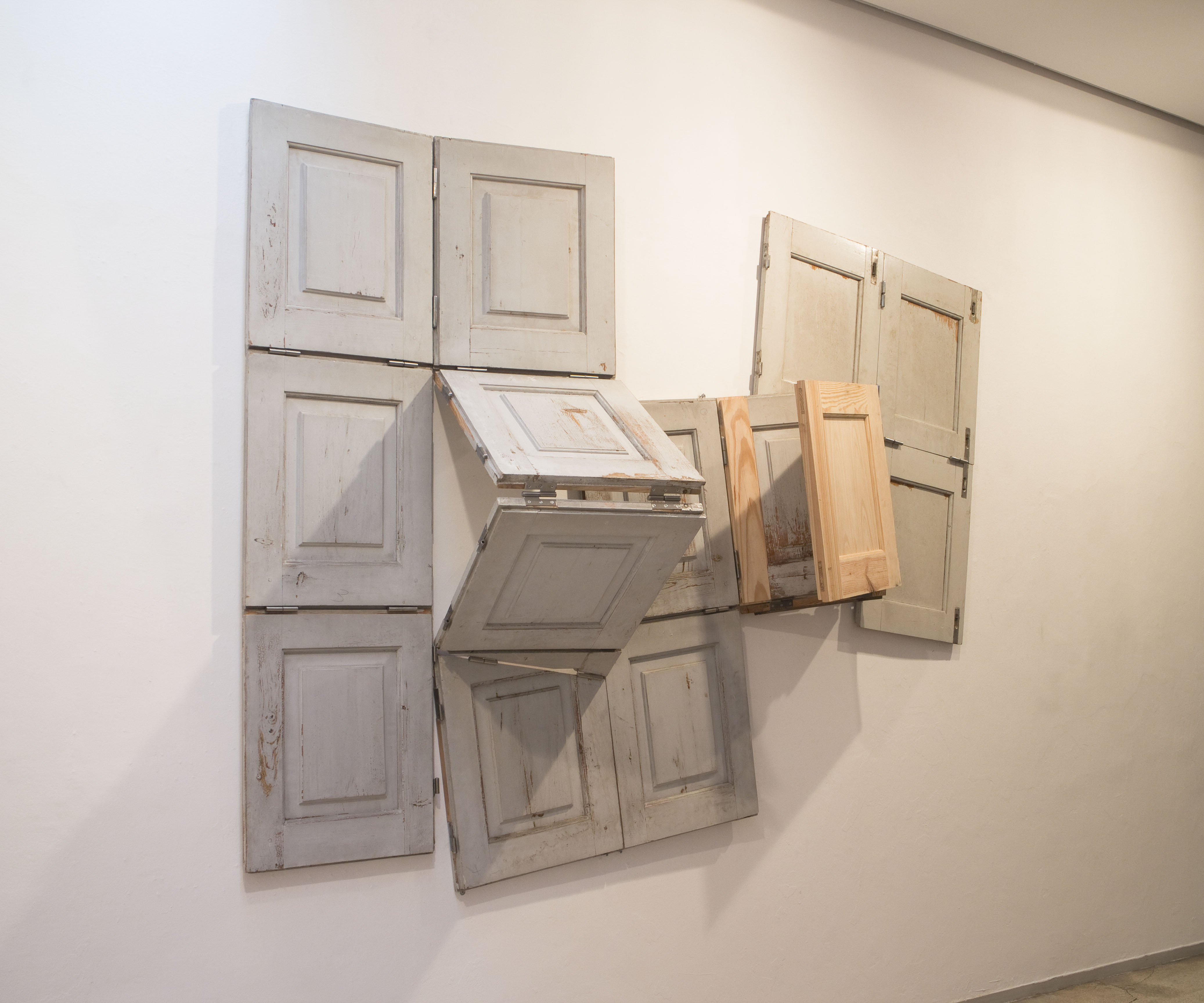 Nuno Sousa Vieira, Para Não Ficarmos Sujeitos a Um Exterior Qualquer, 2014. 15 portadas de madeira e ferragens, 220x260x40cm. Exposição “O pouco ou muito a diferença é pouca”, Módulo Centro Difusor de Arte. Cortesia do artista. Fotografia da exposição Making Art Happen.