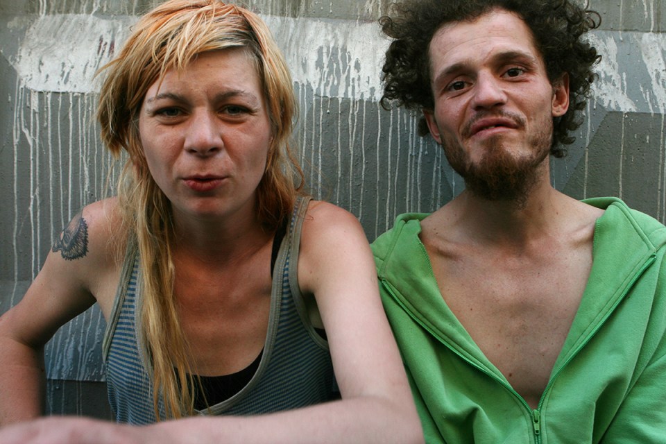 Lila and pasha are resting on the pavement after a long-time period of drug-using and alcohol-drinking.