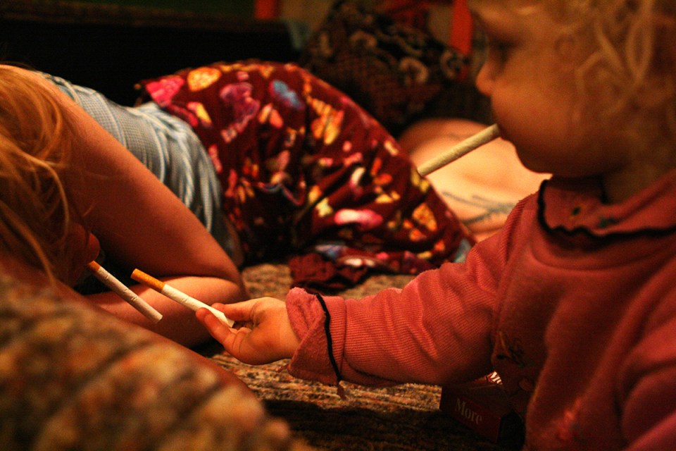 Anfisa is playing with the cigarettees of her sleeping mother.