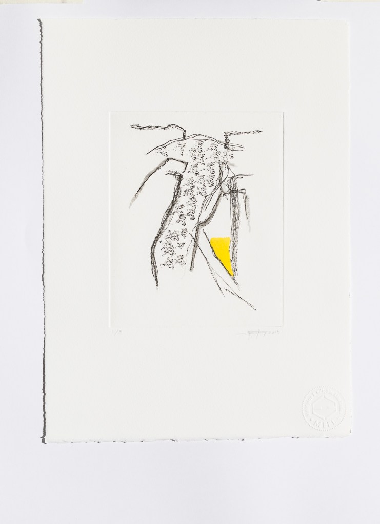 Soft varnish, hard varnish, aquatint and monotype on 300-gram Somerset Radiant White paper