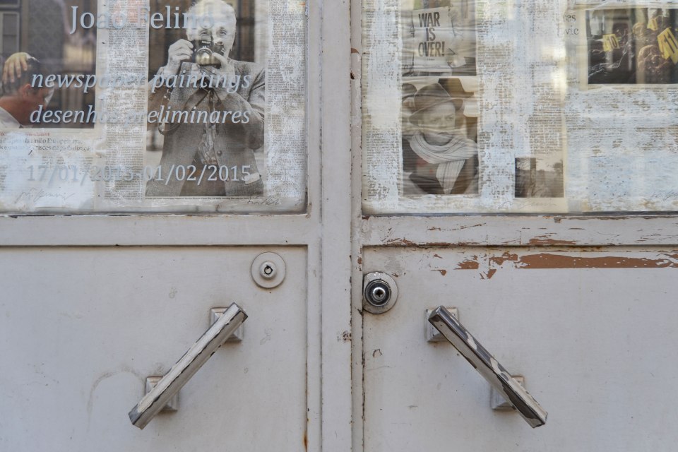 Joao Felino, da série newspaper paintings; desenhos preparatórios, acrílico sobre papel de jornal; dimensões variáveis de acordo com o formato original da folha de papel; 1990 – ongoing; vista de pormenor da instalação; newspaper paintings ‘ desenhos preliminares, A Montra, Lisboa, Jan 17 – Fev 1, 2015. © fotografia Raquel Melgue.