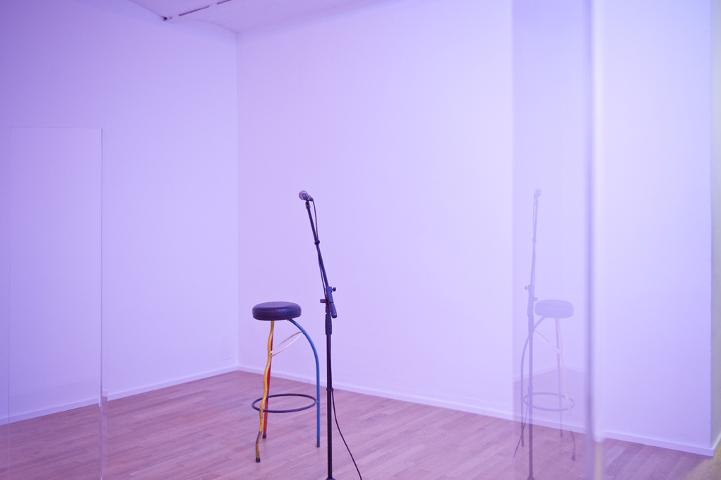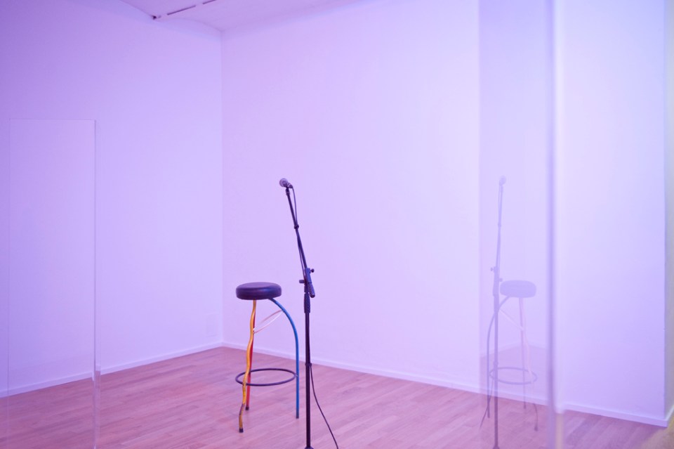 André Romão, Ghost sitting on a bar stool, 2015 “Duplex” chair by Javier Mariscal and Fernando Salas, 1980. Microphone, stand, speaker, text, ghost. Sculpture I, 2015 Acrylic glass. Sculpture II, 2015 Acrylic glass. Photo by Roberto Ruiz Arguedas. Courtesy of the artist and The Green Parrot.